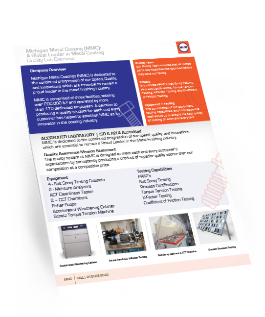 We provide PPAP’s, Salt Spray Testing, Process Certifications, Torque Tension Testing, K-Factor Testing, and Coefficient of Friction Testing.